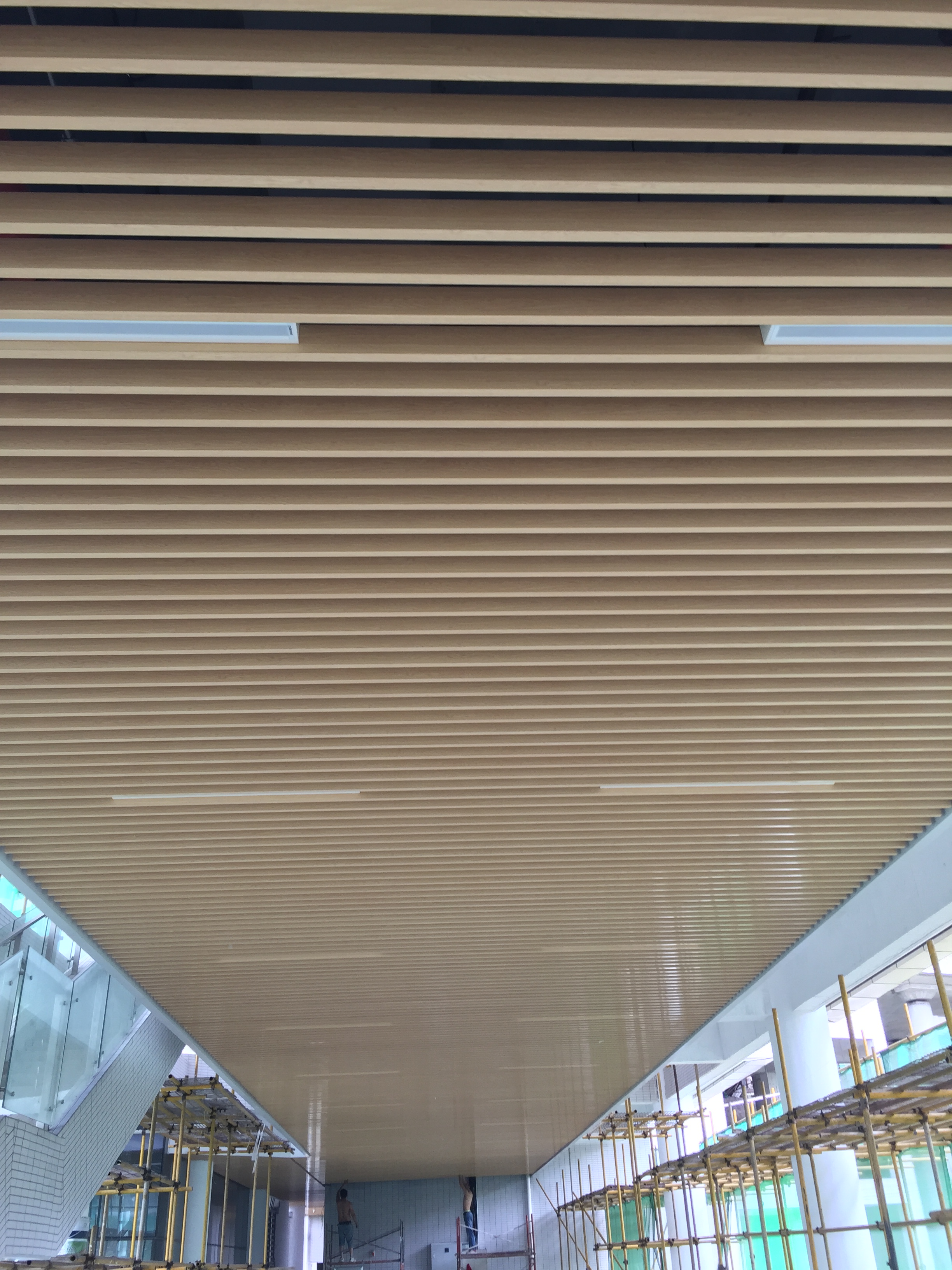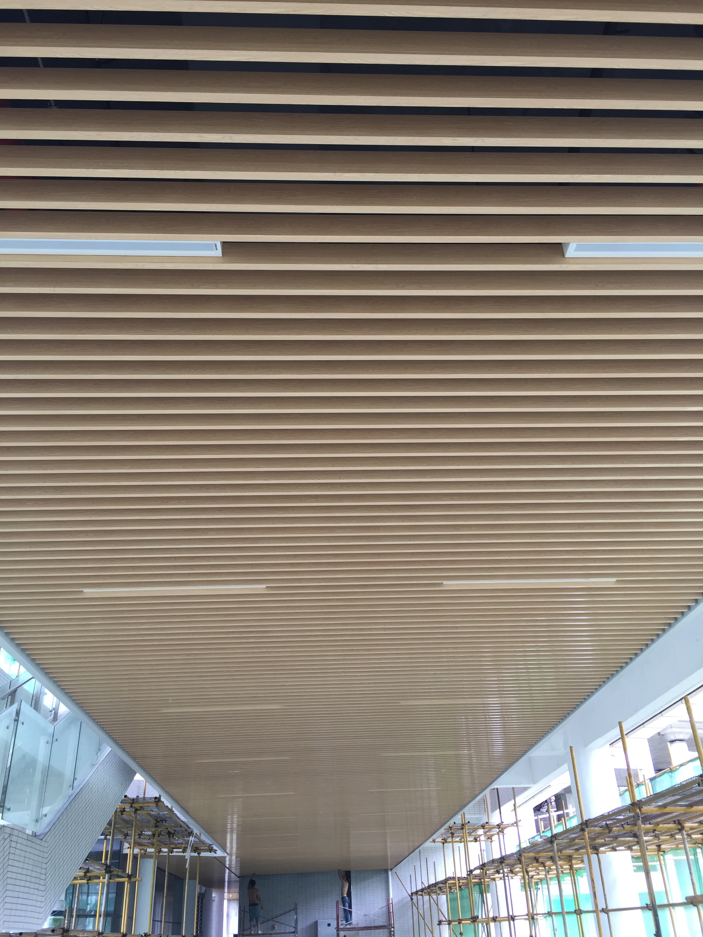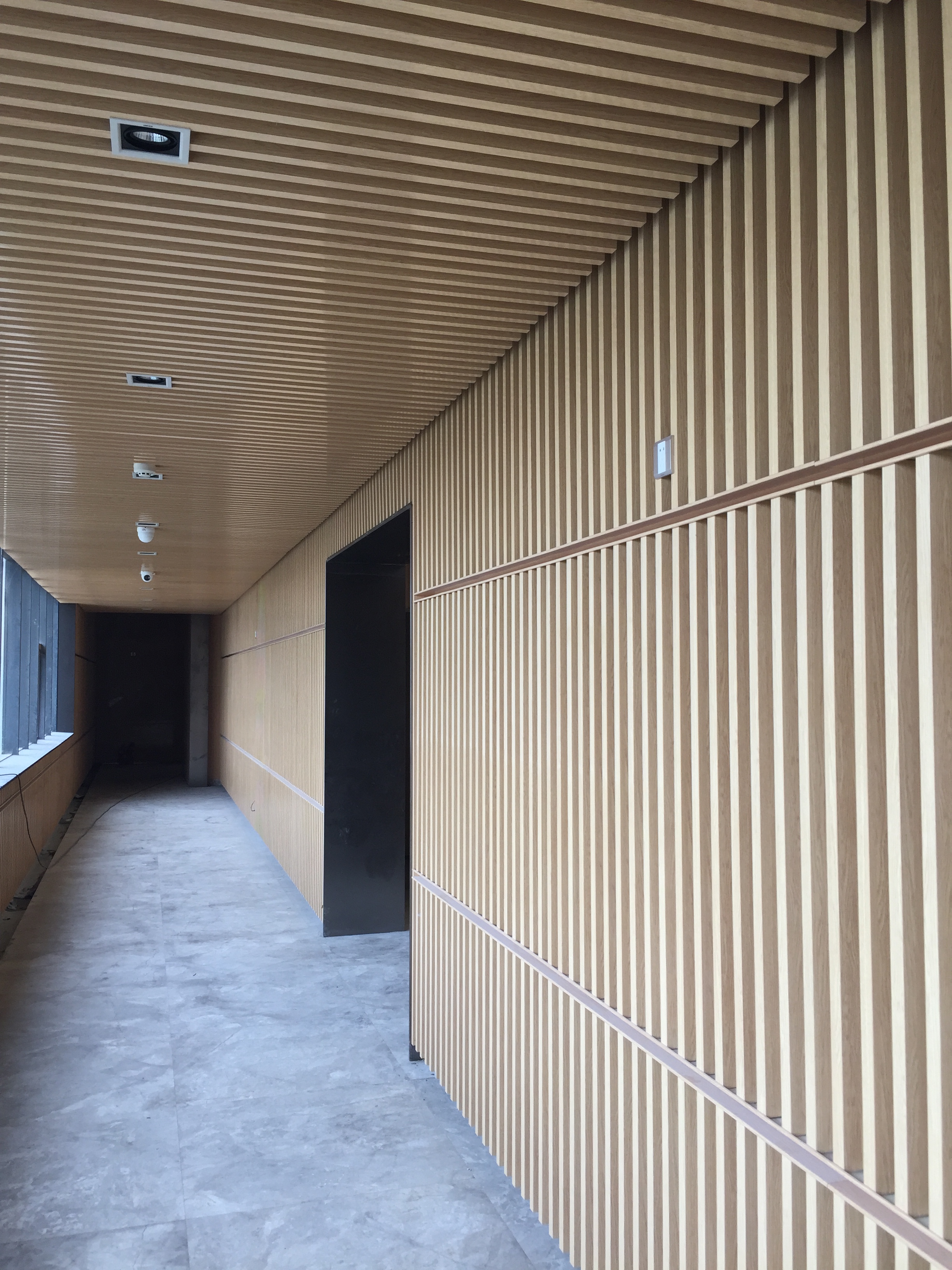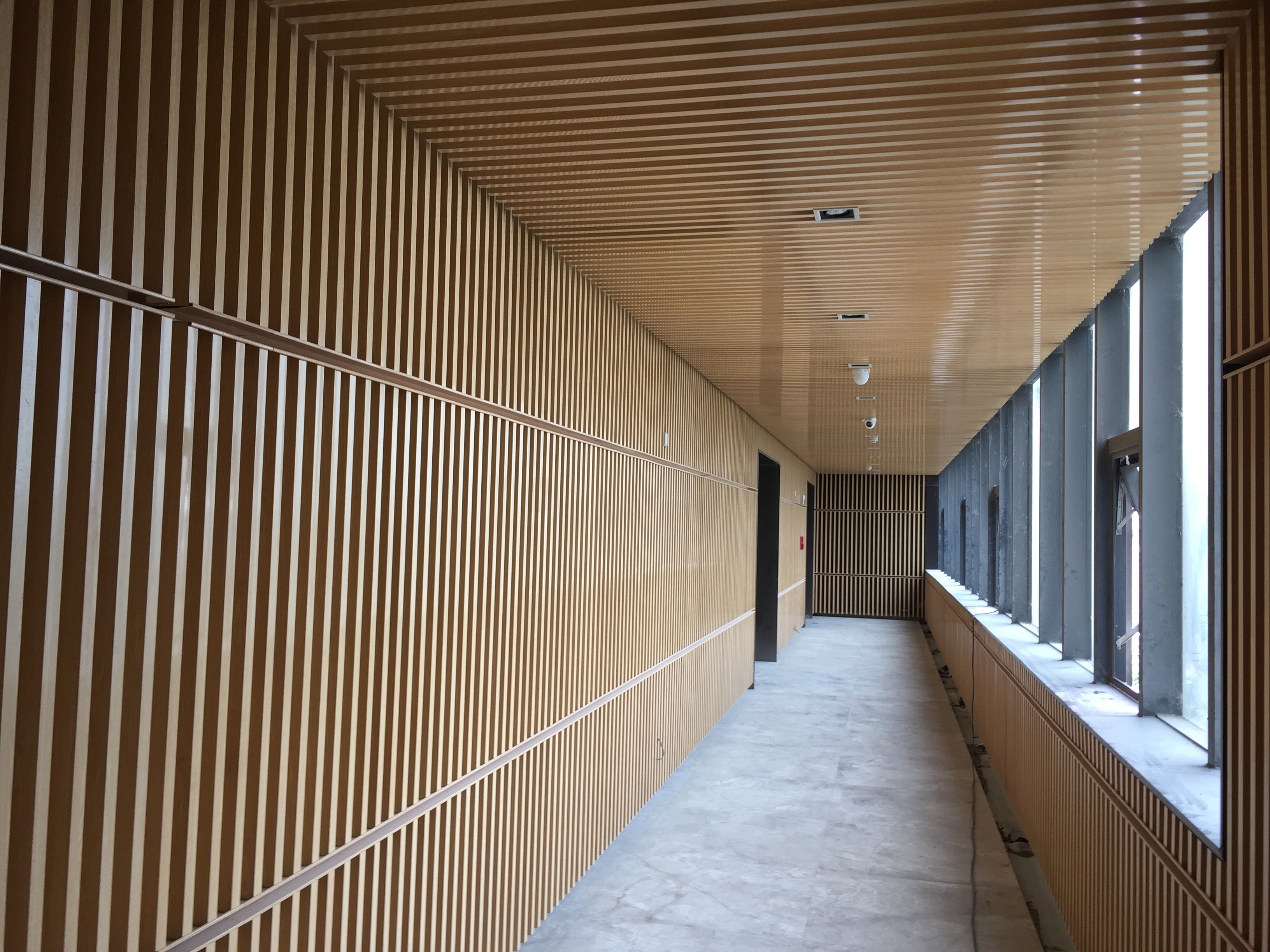廣州南湖山莊走道裝飾仿木紋鋁方通天花與鋁方通墻面