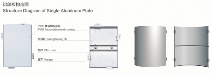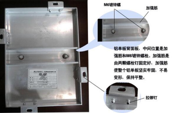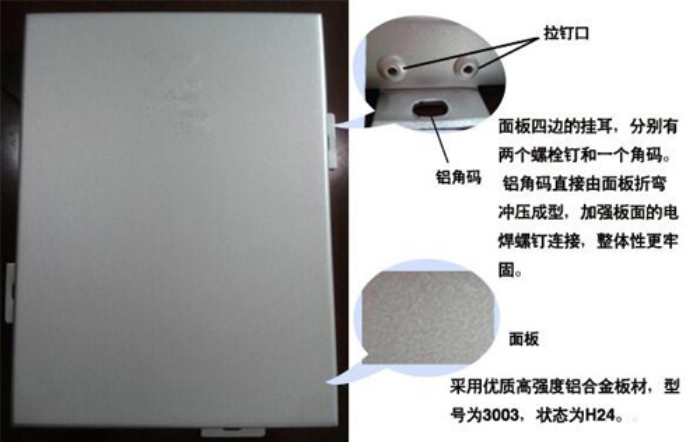 鋁單板主要由面板、加強(qiáng)筋、掛耳(角碼)等組成。一般面板四周折邊;掛耳與面板主要用抽芯鉚釘連接,面板通過掛耳與骨龍相連;面板背面焊有螺栓、通過螺栓把 加強(qiáng)筋和面板聯(lián)系起來,形成一個牢固的整體,加強(qiáng)筋起到增加鋁單板剛性的作用,保證鋁單板在長期使用中的抗風(fēng)壓特性和平整性。